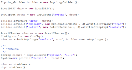 DRPC可以在本地模式运行。下面的例子说明了如何运行本地模式的DRPC: