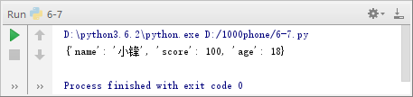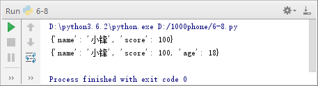 在例6-7中,第2行修改键'name'所对应的值为'小锋',第3行将键值对'age':18添加到字典中。