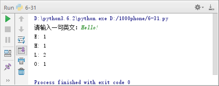输入一句英文,统计英文中出现的字母及次数,使用字典保存每个字母及次数,具体实现如例6-31所示。