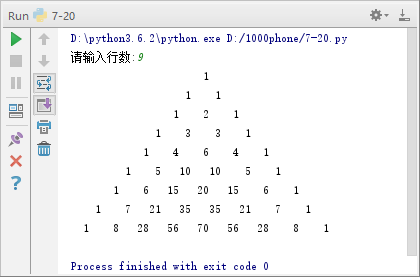 在图7.25中,列出了杨辉三角形的前9行。每一层左右两端的数都是1并且左右对称;从第1层开始,每个不位于左右两端的数等于上一层左右两个数相加之和,具体实现如例7-20所示。