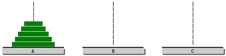 假设使用1、2、3、…、n标记n个大小互不相同的圆盘,A、B、C标记3个柱子,初始状态时所有圆盘都放在A柱子上,最终状态时所有的圆盘都放在C柱子上,柱子C作为中间缓冲。
