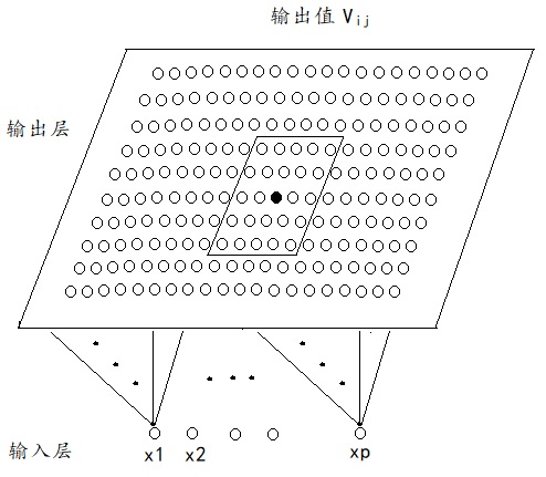 输出节点(i,j)属于响应节点(i0,j0)的邻域,u(t)是循环次数的函数,f(d)是随输出节点(i,j)与响应节点(i0,j0)之间的距离而变化的邻域函数,x(k)是输入向量的第k个分量。