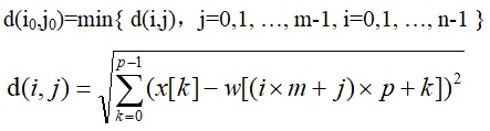 对于输入向量x[k],k=0,1, …, p-1,在n×m个输出节点中产生一个响应节点,这个响应节点的连接权重与输入向量之间的距离和其他输出节点相比是最小的,即响应节点(i0, j0)满足如下条件: