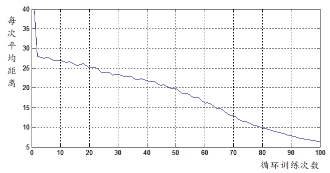 每一次循环训练计算一次响应节点权重与输入向量绝对距离的平均值(响应距离),以便观察随着训练循环次数的增加输入与输出响应节点的接近程度。假设第k次循环中第t个样本训练时,xi(t)是输入样本,wi(k,t)是响应节点的权重,计算这次响应距离d(k,t)如下: