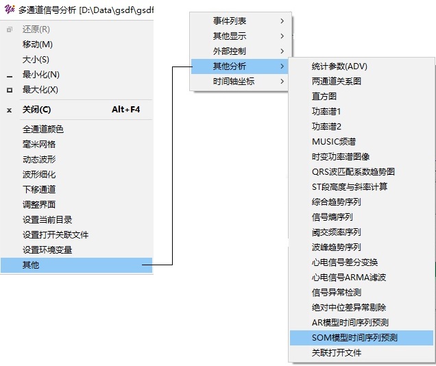 MUSIA软件操作:在波形窗口波形区外左右两边点击鼠标右键弹出菜单中选择《其他分析》→《SOM模型时间序列预测》,或者从标题栏左上角点击鼠标左键弹出菜单中选择。如下图所示。