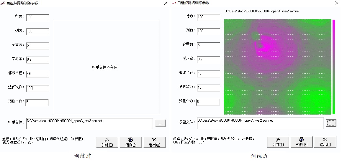 出现如下对话框。当权重文件不存在时,需要设置好训练参数用当前可见数据训练SOM网络。也可以在之前训练结果的基础上继续训练,初始学习率和邻域半径设置可以小些。网络训练完成后可以使用该网络对时间序列未来值进行预测。