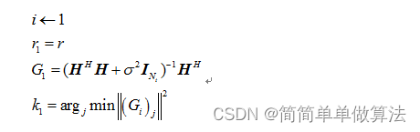 VBLAST算法,通过如下步骤实现,MMSE接收器抑制了干扰和噪声成分,但是ZF接收器仅仅排除了干扰的成分。这暗示了在发射符号和接收器估计的均方误差达到最小值。因此,MMSE在噪声存在的情况下性能要优于ZF接收器。其运算法则如下所示: