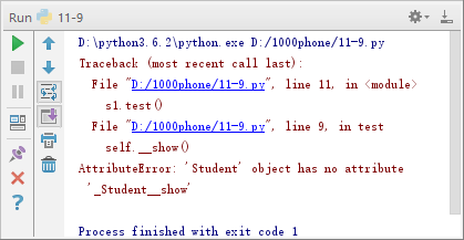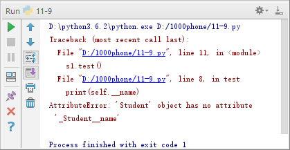 此外,私有属性在类外不能直接访问,但程序在测试或调试环境中,可以通过“对象名._类名”的方式在类外访问,如例11-4所示。