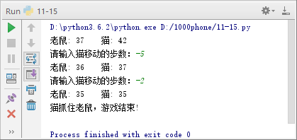 小伙伴在童年时都看过《猫和老鼠》,本案例实现猫捉老鼠游戏,猫与老鼠的位置用整数代替,游戏开始时,猫与老鼠的位置随机,之后老鼠移动的步数在[-2, -1, 0, 1, 2]中随机选择一个,猫移动的步数通过用户输入,当老鼠位置与猫位置相同时,游戏结束,具体实现如例11-15所示。