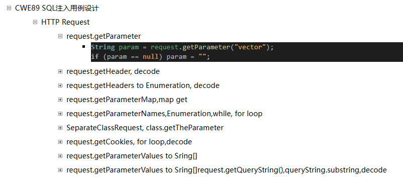这里以我们熟悉的:CWE89 SQL注入问题来说明这种用例的设计方式。用例集中CWE 89 SQL注入问题一共有 232 个正例,272 个反例,共计504 个用例。