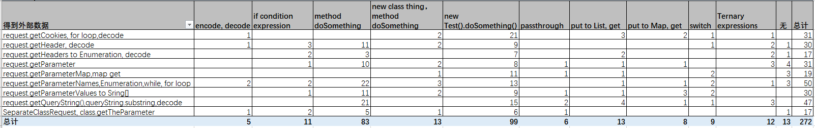 得到上面三种基本节点后,通过组合的方式形成用例。下表列举了 CWE89 SQL注入 272 个反例组合的场景: