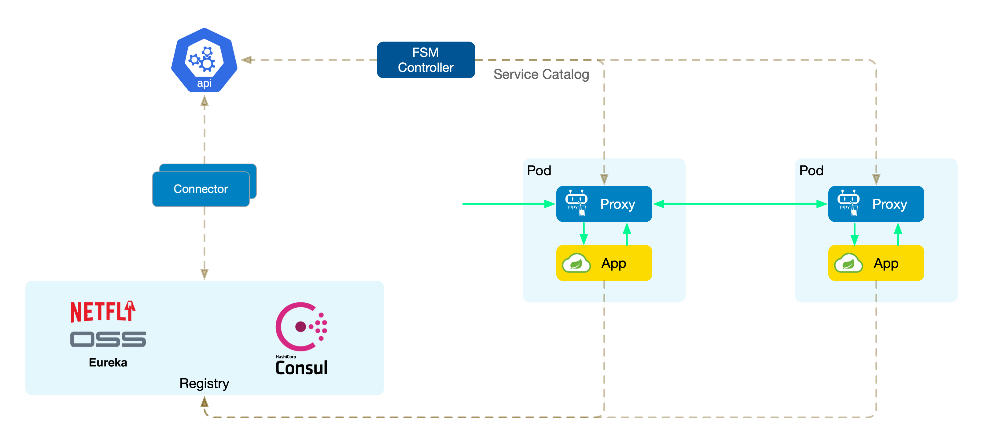 FSM 通过使用特定于框架的连接器(Connector)来实现与不同微服务注册中心的对接。每个连接器都负责与特定注册中心(如 Consul、Eureka 或 Nacos)通信,执行服务注册信息、监控服务变更、封装为 K8s Service、写入集群等关键任务。
