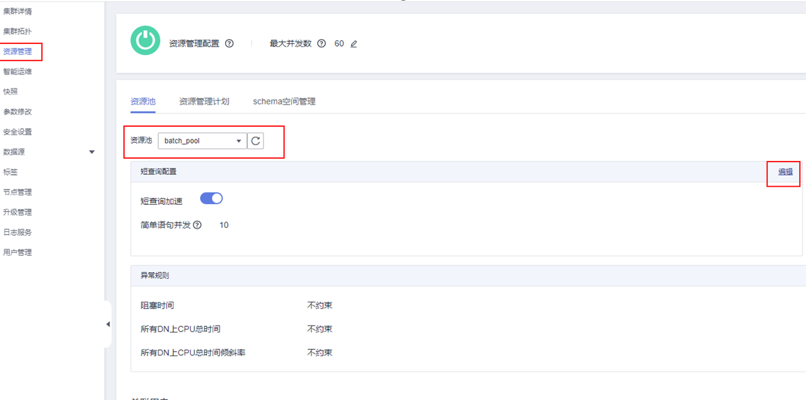 - 资源池限制短查询并发方法:资源管理->资源池->编辑->简单语句并发
