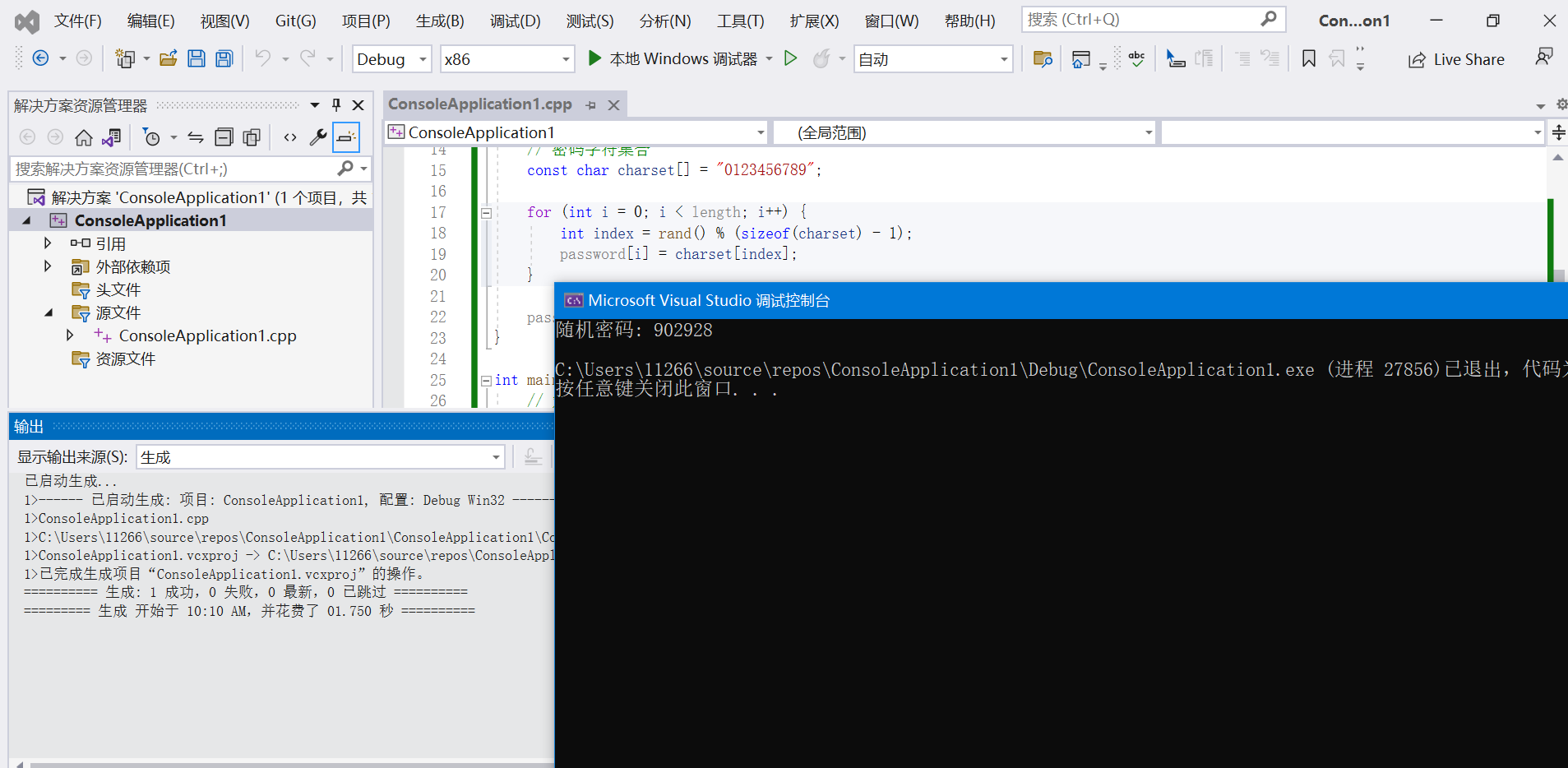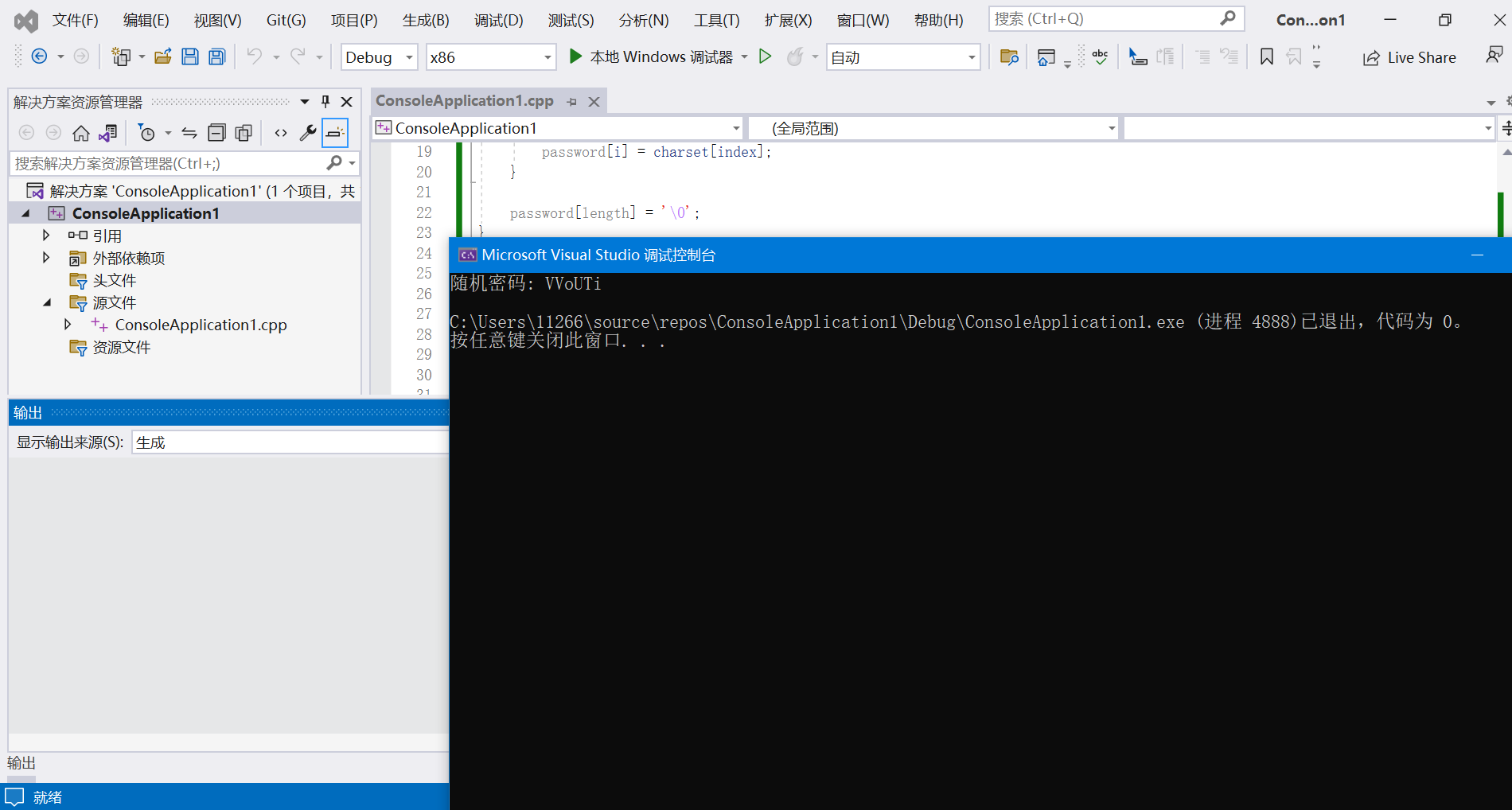 这个代码中,generatePassword 函数用于生成随机密码。该函数使用 srand 函数初始化随机数生成器,然后在字符集合中随机选择字符,将其添加到密码字符串中。最后,将字符串末尾添加空字符。