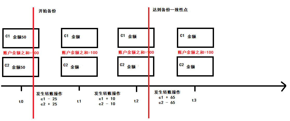 当我们在任意时刻发起备份,备份达到一致性点的时刻,数据的整体预期就是明确的,如C1 + C2=100 。