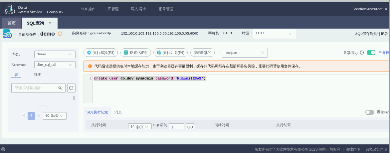 创建名为demo的数据库,其他参数可以使用默认值。点击SQL查询。使用create user db_dev sysadmin password 'Huawei123#$';命令,在demo库下创建db_dev用户,并授予sysadmin的权限。