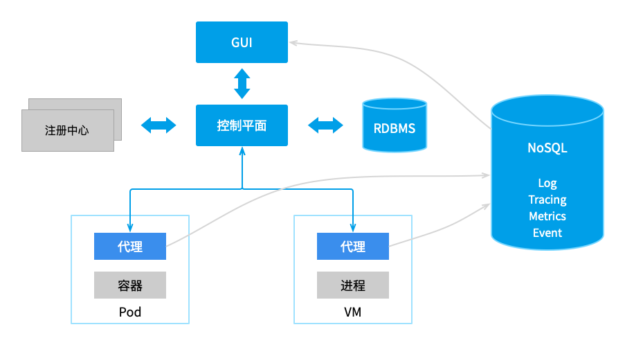 控制平面负责配置的下发和管理,包括流量处理规则和控制策略等,同时收集数据平面的节点信息,并将这些配置持久化到关系型数据库(RDBMS)中。这不仅确保了配置信息的安全性,也提高了系统恢复的能力。