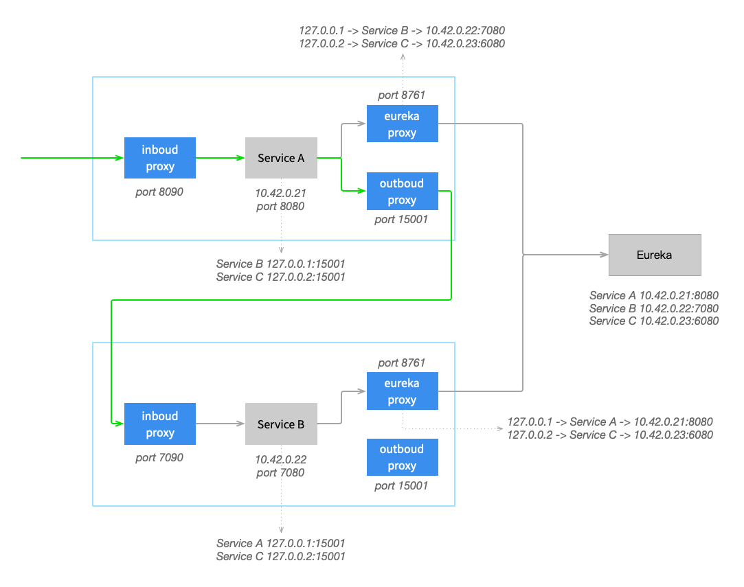 127.0.x.x,在 Linux 内核中这种 IP 会使用 loopback 网卡处理)并在本地维护回环地址与服务的映射;同时为服务维护一份端点的列表;服务实例的真实端口做一定的偏移,比如服务的监听端口为8080,偏移之后的端口为8090。8090也是服务的 sidecar 代理监听的入站端口。 - 服务获取到的是分配的回环地址,端口则是本地 sidecar 代理监听的出站端口。