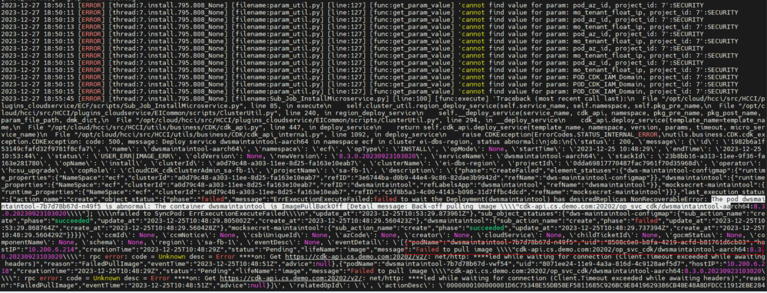 2、查看后台部署日志,上图工步错误日志详情路径+任务id,发现获取运维容器镜像失败,且网络请求超时