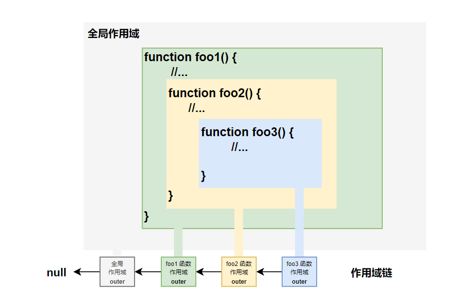 比如对于以下嵌套函数,其作用域链是:foo3->foo2->foo1->global,该作用域链是在代码写好后就确定了,与是否调用函数或者代码执行无关。