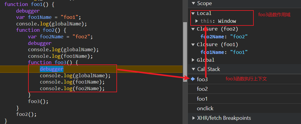 foo3()时, 调用栈(Call Stack)的栈顶是foo3()函数执行上下文,其作用域是 Scope 中的 Local 作用域,当前作用域没有变量,其打印的变量需要从其他作用域中获取,同样是沿着作用域链查找:
