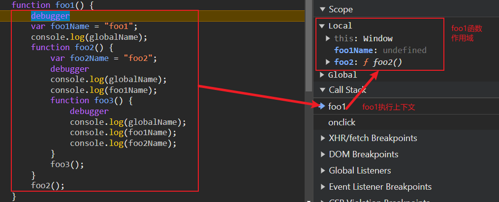 foo1()时,调用栈(Call Stack)的栈顶是foo1()函数执行上下文,其作用域是 Scope 中的 Local 作用域: