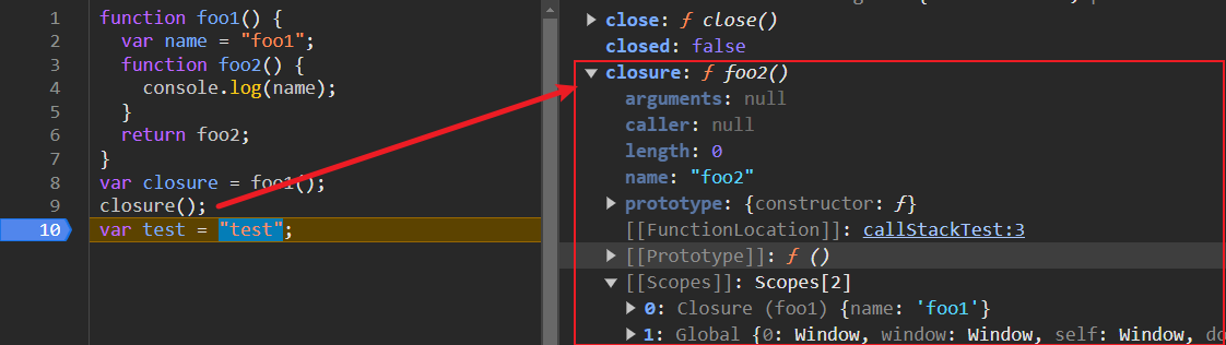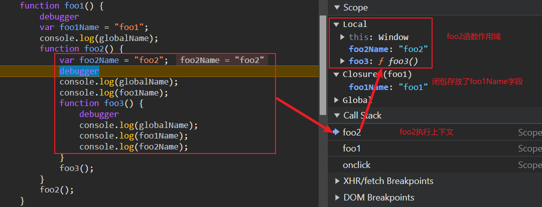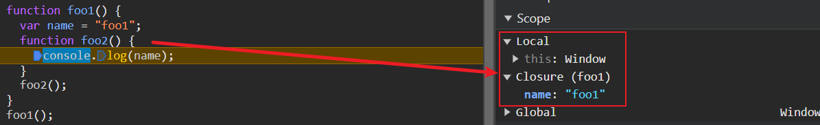 foo2()时, 调用栈(Call Stack)的栈顶是foo2()函数执行上下文,其作用域是 Scope 中的 Local 作用域,Local 下面的 Closure(foo1)实际上就是闭包,此时foo2()中函数的console.log(foolName)是foo1()中的 foo1Name 字段