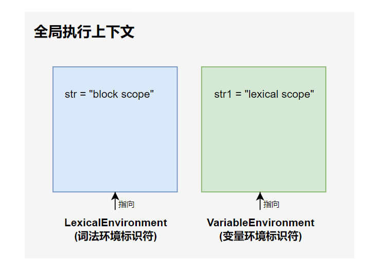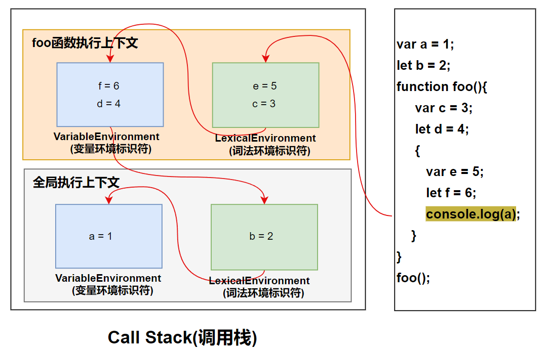 - 然后在执行上下文中,按照先词法环境后变量环境的顺序查找