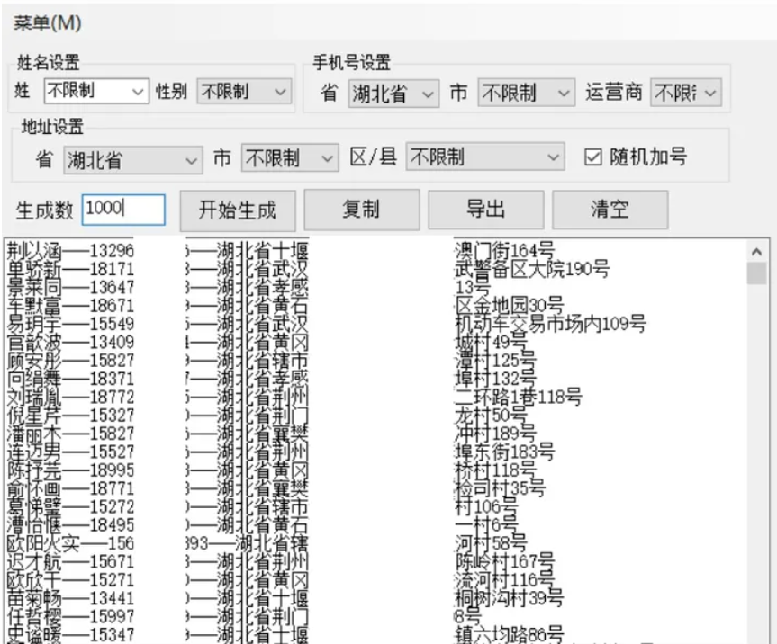 (1)选择你需要生成的地址选项,内置名字和号码选项,也可以什么都不用选择,均为选择不限制即可