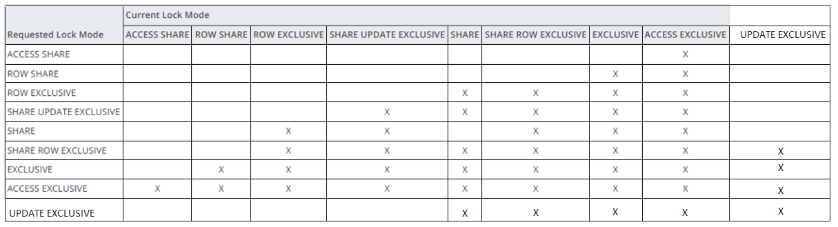 - 常规锁按照粒度通常可分为1~8个等级,DWS在8.2.1(及以上)版本中新增了第9级锁(UPDATE EXCLUSIVE),各操作对应的锁等级及锁冲突情况参照下表: