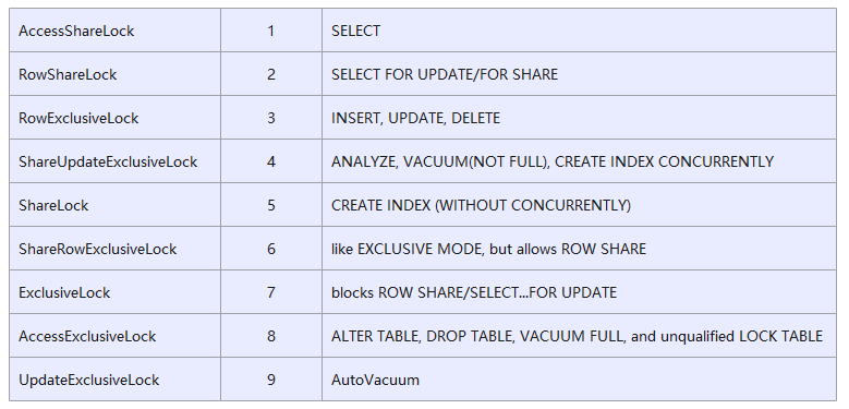 - 常规锁:常规锁主要用于业务访问数据库对象的加锁,保护并发操作的对象,保持数据一致性;常见的常规锁有表锁(relation)和行锁(tuple)。