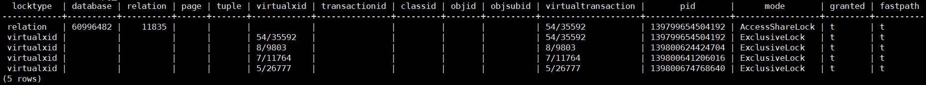 pgxc_lock_conflicts视图提供集群中有冲突的锁的信息(适合锁冲突现场还在时使用),目前只收集locktype为relation、partition、page、tuple和transactionid的锁的信息,需要关注的字段nodename(被锁定对象节点的名字)、queryid(申请锁的查询ID)、query(申请锁的查询语句)、pid、mode、granted。
