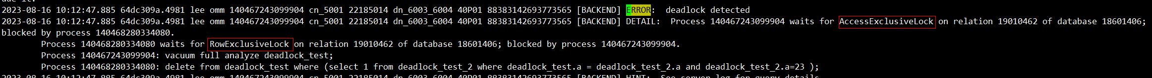 - vacuum full 与delete select语句造成的死锁(等同一对象的不同锁);部分业务场景下,存在查询时间窗在白天,而业务跑批删除只能在晚上执行,同样为了保证查询效率降低脏页率,对业务表的vacuum full操作也在晚上,时间窗重合,升锁过程便可能产生死锁;
