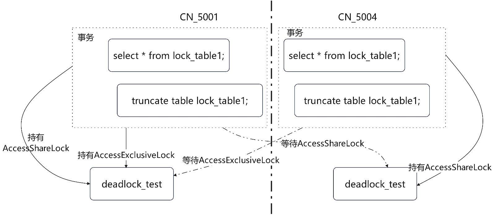 CN_5004的truncate语句线程号为:139887432832768;在等待线程号为:139887210493696的truncate语句释放lock_table1的AccessExclusiveLock;同时该线程:139887432832768持有lock_table1的AccessShareLock;这种场景下在不同实例上分布式的等待关系,便形成了分布式死锁。