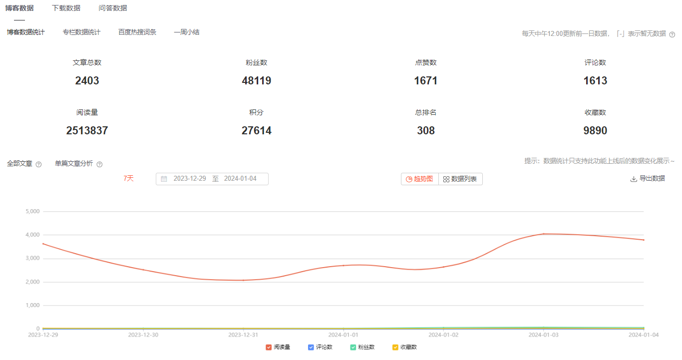 2023年是难忘和成熟的一年,同时也是收获满满的一年,这一年有幸被评为博客之星TOP13(),相较于去年又有了巨大的提升,因为专业的限制,所以整体的博客阅读量和点赞以及收藏都相对较少,过去一年产出的高质量文章超过300篇,共计307篇,这些文章大部分是关于Google Earth Engine、PIE-ENGINE以及AI Earth和中科星图的有关和遥感云计算相关的内容,整个创作内容主要是超过80%以上是以公开的数据资源、GEE中常见的用户错误总结以及与GEE相关的高质量文献的代码分享等等。以下的图片是展示的我创作的过程以及创作的频率,基本上每天都在更新,而且有时候更新的博客篇数超过4-5篇/天。