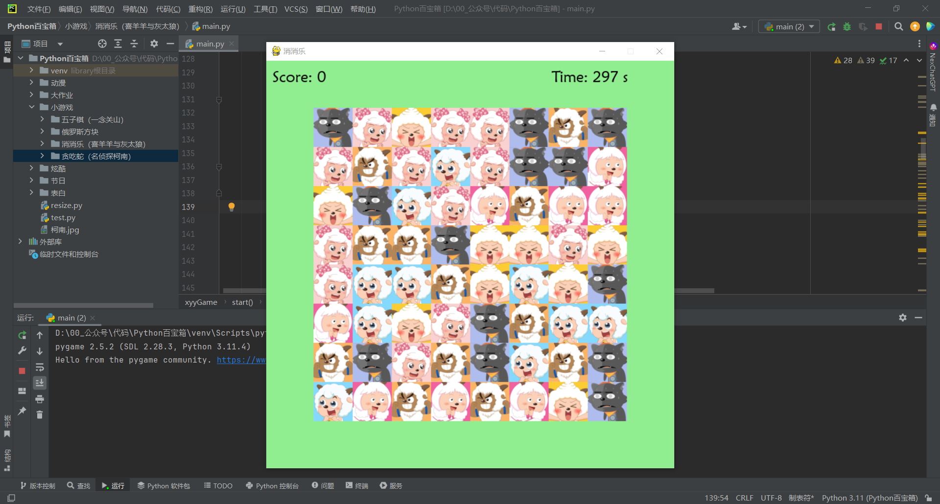 本期内容:基于pygame实现喜羊羊与灰太狼版消消乐小游戏