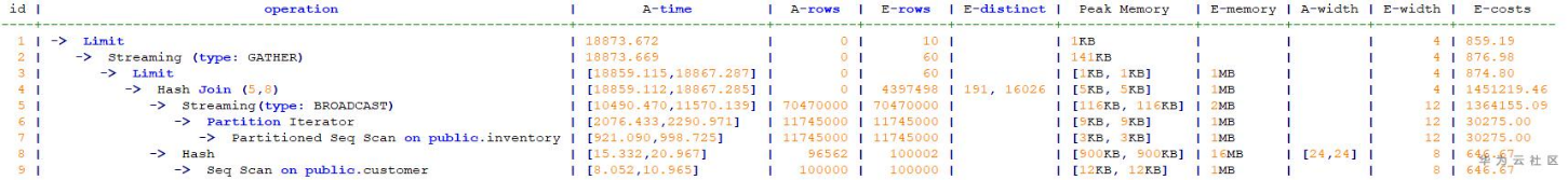 下图为一个执行计划示例,最下面对customer表做顺序扫描,做Hash之后与第5行中的结果做Hash连接。而第5行中的结果是由对inventory表进行分区扫描之后broadcast重分布后得来的。
