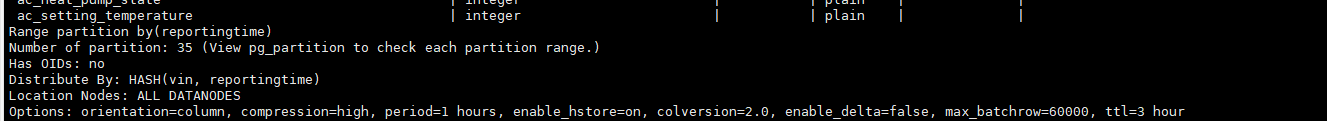 下图所示表结构为列存分区表,压缩级别为高。Hstore打开,delta表关闭(目前不建议打开列存表的delta表功能)。该表以reportingtime为分区键,一共35个分区。以vin和reportingtime做Hash分布。