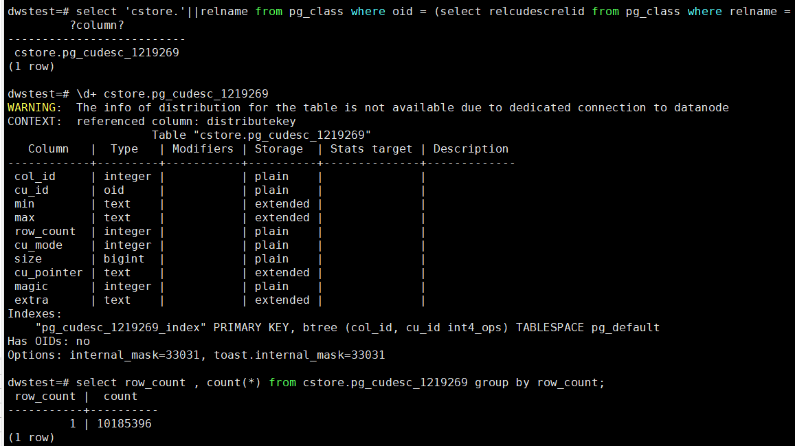 特别的,对于列存表来说,由于可能存在小批量入库情况,我们还需要查询列存表的小CU情况