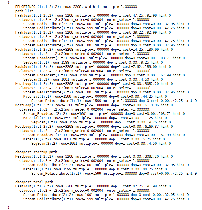 我们先记住这三组Path名称:path_list,cheapest_startup_path,cheapest_total_path,后面两个就对应了动态规划的局部最优解,在这里是一组集合,统称为最优路径,也是下一步的搜索空间。path_list里面存放了当前Rel集合上的有价值的一组候选Path(被剪枝调的Path不会放在这里),cheapest_startup_path代表path_list中启动代价最小的那个Path,cheapest_total_path代表path_list里一组总代价最小的Path(这里用一组主要是可能存在多个维度分别对应的最优Path)。t2表和t3表类似,最优路径都是一条Seq Scan。有了所有基表的Scan最优路径,下面就可以选择关联路径了。