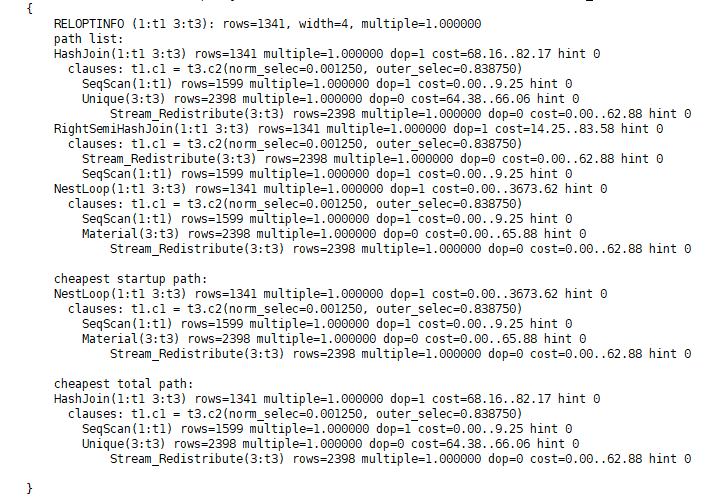 每取一对内外表的Path进行Join时,也会判断是否需要重分布、是否可以去重,选择关联方式,比如JoinRel(t1, t2) join t3时,也会尝试对t3表进行去重的Path,因为这个Join本质仍然是Semi Join。下图是选择过程中产生的部分有价值的候选路径(篇幅所限,只截取了一部分):