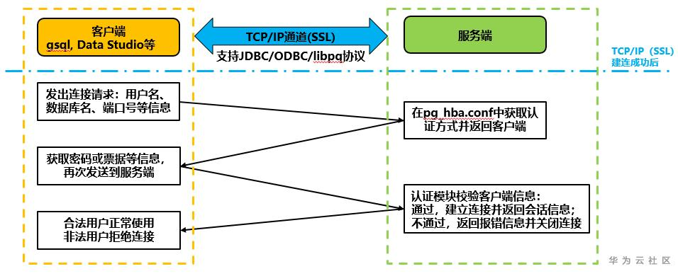 连接认证机制就是GaussDB(DWS)数据安全的一套有效防护机制,连接认证机制可以防止非法用户入侵GaussDB(DWS)系统内部。GaussDB(DWS)是基于客户端/服务器(C/S)架构的系统,通信过程是基于TPC/IP协议,为了确保用户访问的可信,建立了连接认证机制:通过安全套接字层(SSL)实现通信双方的证书校验和秘钥协商从而保护网络连接,通过服务端的认证模块确保用户名和密码合法。