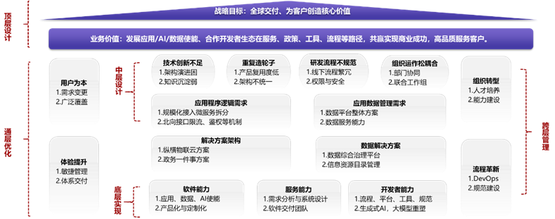 中层设计:经过开发中心架构师、研发同事20+人次访谈后,面向技术创新,规避重复造轮子,DTSE协助伙伴规范研发流程,加强组织协同,深入访谈、剖析内在的业务需求。应用是业务的核心表现形式,业务需求又可落地为更具体的应用需求,并进一步划分为面向应用程序逻辑(如高内聚低耦合的微服务拆分)和面向应用数据管理(如数据使能平台方案集成能力)的两大类需求,梳理应用架构现代化(如纵横物联云平台方案为例)和数据架构现代化(如数据综合治理平台为例)实现了从需求到解决方案的映射。