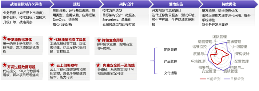 评估和改进:需要持续的进行管理和治理,如APM/AOM/Service Stage监控应用的运行情况,持续优化;同时通过应用集成等平台、实现应用的统一管理,并可以和低码平台,serverless结合,实现应用的可组装交付,事件驱动灵活应对突发流量。