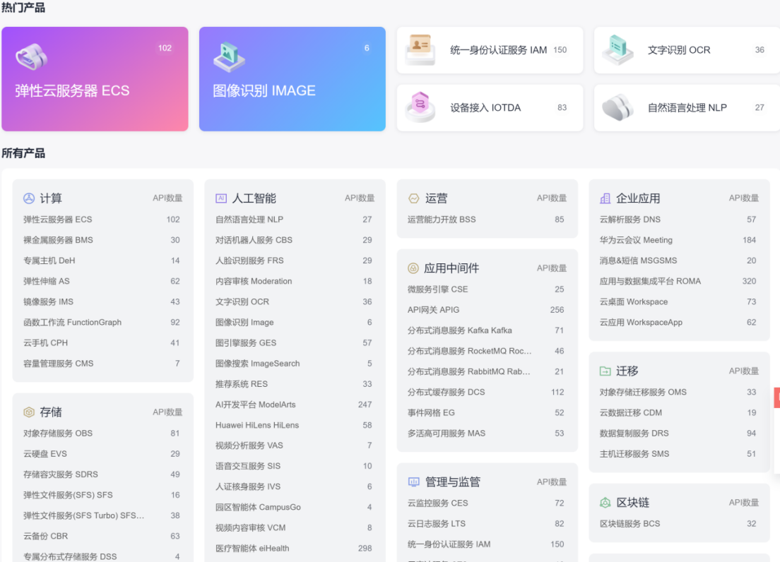 华为云的OpenAPI提供了各类的产品服务,如计算类、存储类、人工智能类、运营类、应用中间件、管理与监管等等诸多的功能品类的API服务可以让我们快速的找到我们需要的具体需求来解决我们的各类问题。并且有着大量的错误码提示,加快异常问题的解决高速、高效的完成我们的开发需求。
