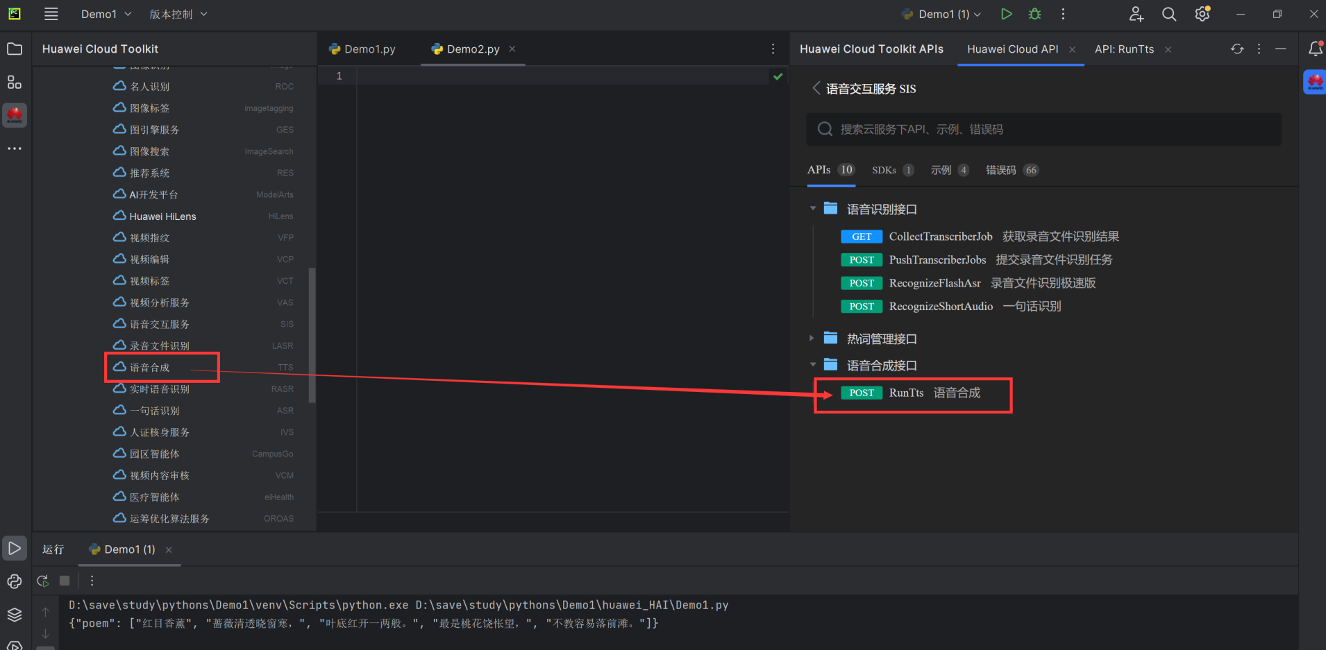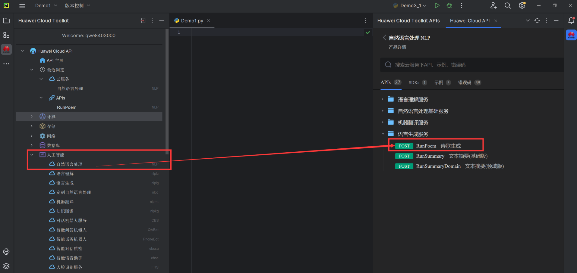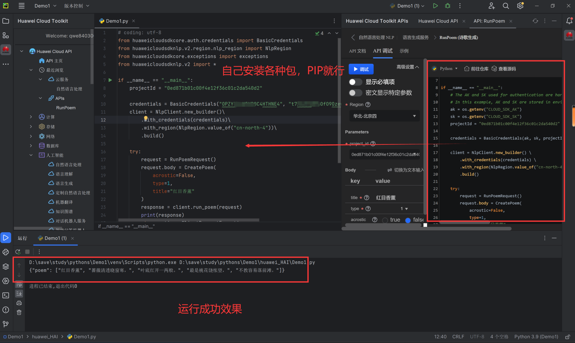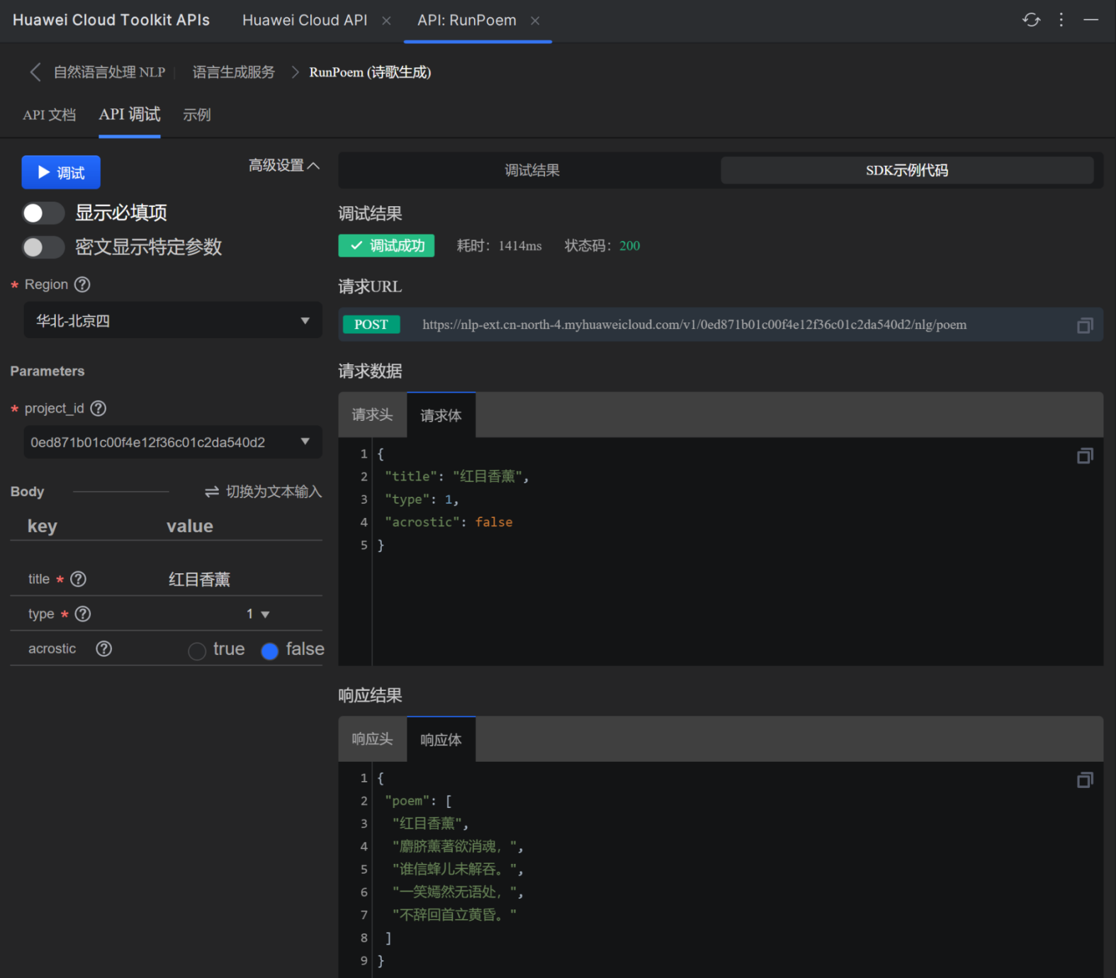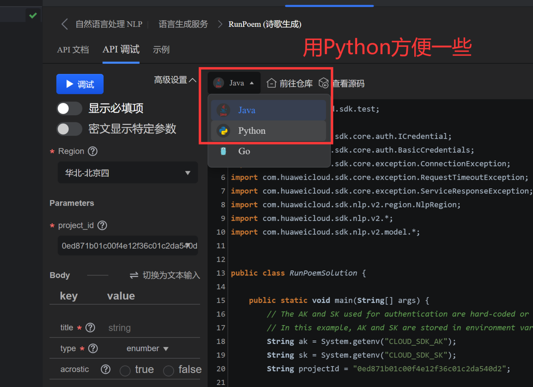 1.选:打开Huawei Cloud API插件,选择"人工智能"->"自然语言处理" ->"语言生成服务"-> "RunPoem (诗歌生成)"2.学:仔细查看接口详情,包括输入参数和输出模型定义,以及SDK示例代码3.写:在业务代码需要调用AP|的地方,直接输入RunPoem, IDE会自动补全调用代码,也将依赖SDK包导入至工程4.Debug:调试写好的代码,查看API返回结果是否符合预期