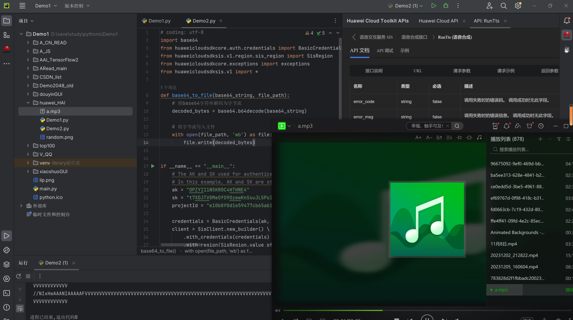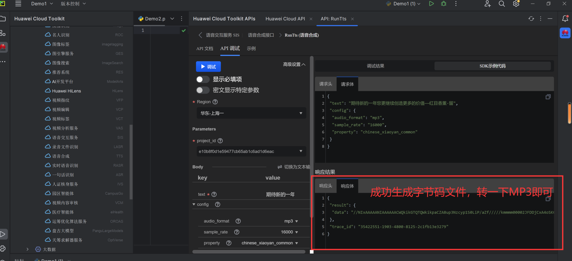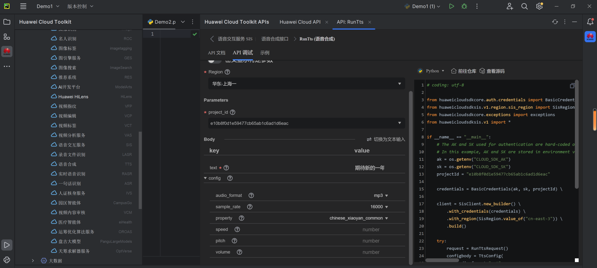 1.搜:打开Huawei Cloud API插件,搜素关键字"语音合成"2.选:找到由SIS云服务提供一个语音合成接口RunTts, 查看接口功能描述,确认是想要的3.学:仔细查看接口详情,包括输入参数和输出模型定义4.用:输入参数,使用API插件的在线调试能力,查看接口返回值5.写:使用Huawei Cloud CodeArts Snap插件,输入想要实现的逻辑作为注释,快捷键Alt +C,选择想要生成的代码6.Debug:调试写好的代码,完成语音合成应用