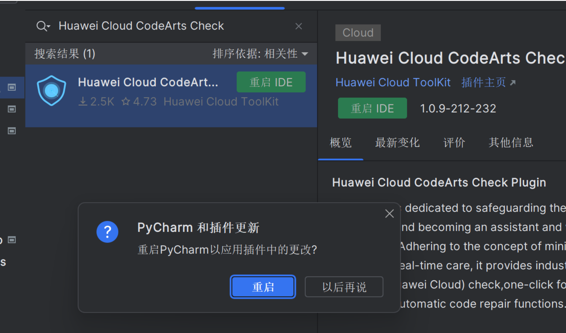 首先需要先在插件商店安装华为云的Cloud API插件,点击【Install】安装即可,安装完毕需要重新启动计算机。