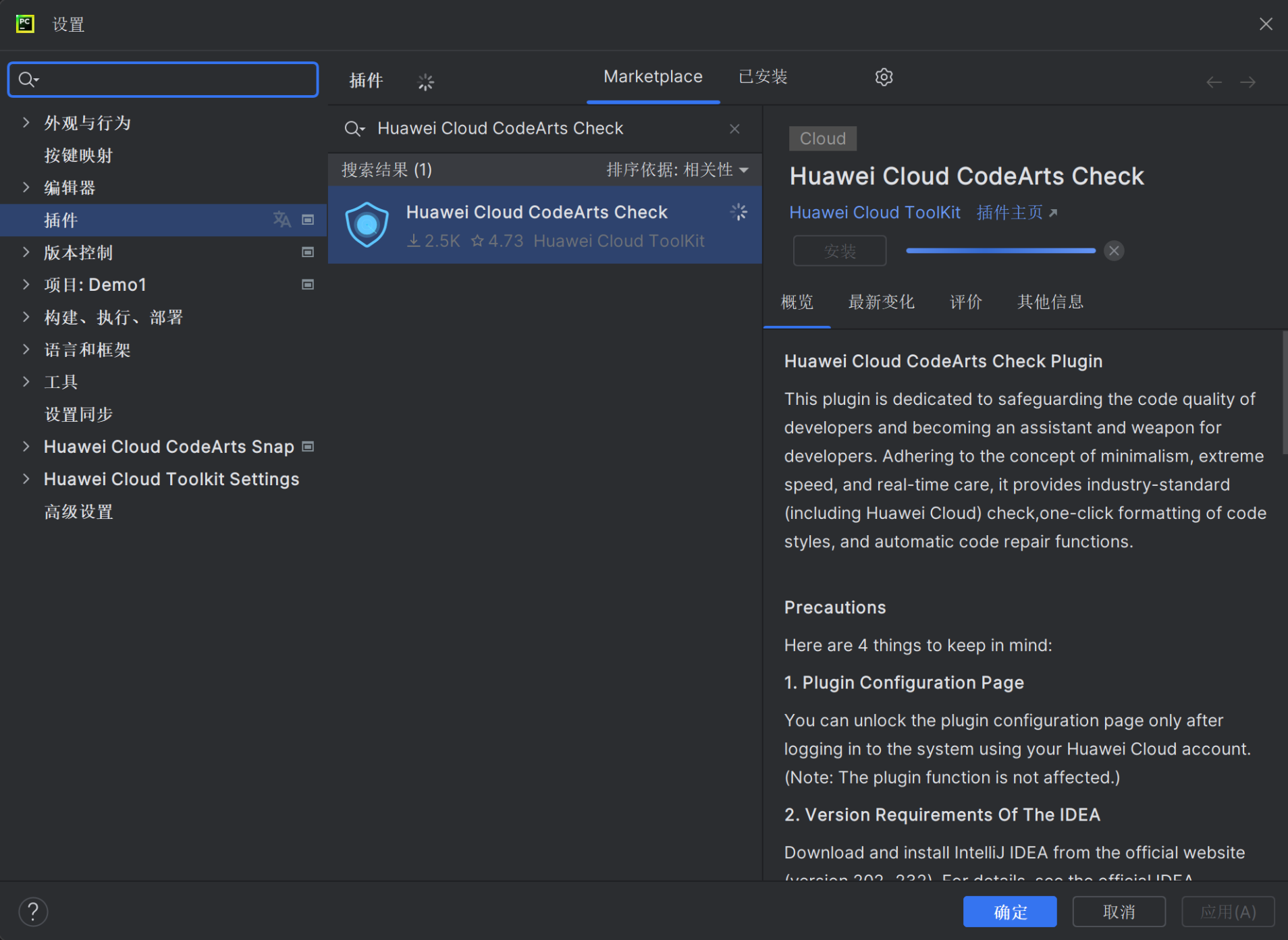 环境搭建:下载安装IntelliJ IDEA,配置好maven、JDK等环境插件安装:文件-> 设置->插件,下载安装Huawei Cloud CodeArts Snap插件