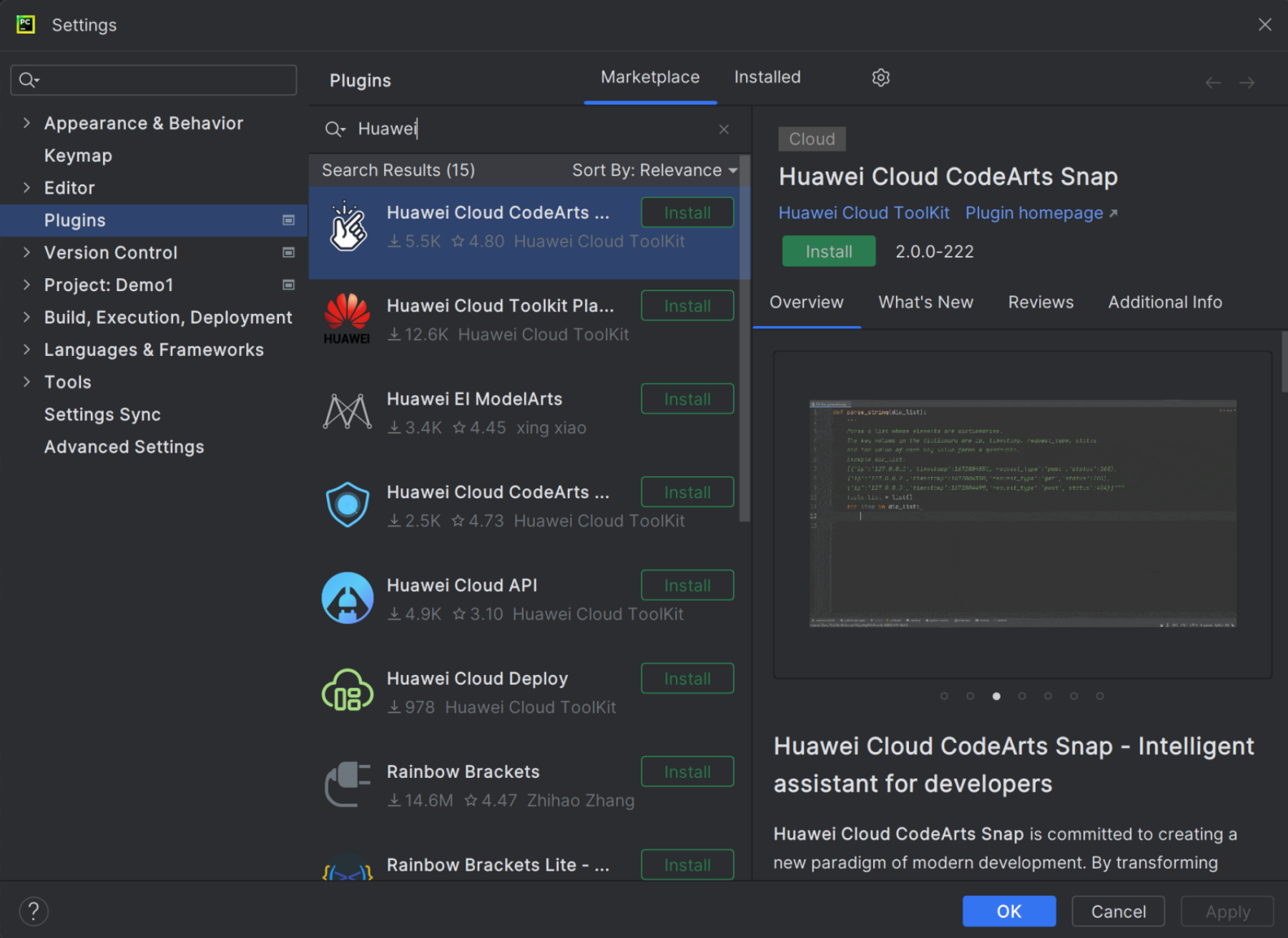 例如我们拿PyCharm Community Edition 举例,可以看到我们点开插件安装的时候搜索Huawei就能看到华为的猪都插件都可以下载使用。